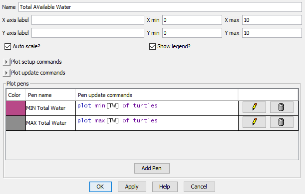 您正在请求您的图解来显示海龟的TW,但是TW是一个全局变量-- TW只有一个值。当您请求[TW] of turtles时,您将返回一个相同值的列表(无论当前的TW是什么),这些值的长度与当前海龟的数量相同。例如,假设您有5只海龟和一个TW为11;当您请求plot max [TW] of turtles时,您实际上是要求Netlogo绘制[ 11 11 11 11 11 ]的最大值,最小值也是如此。