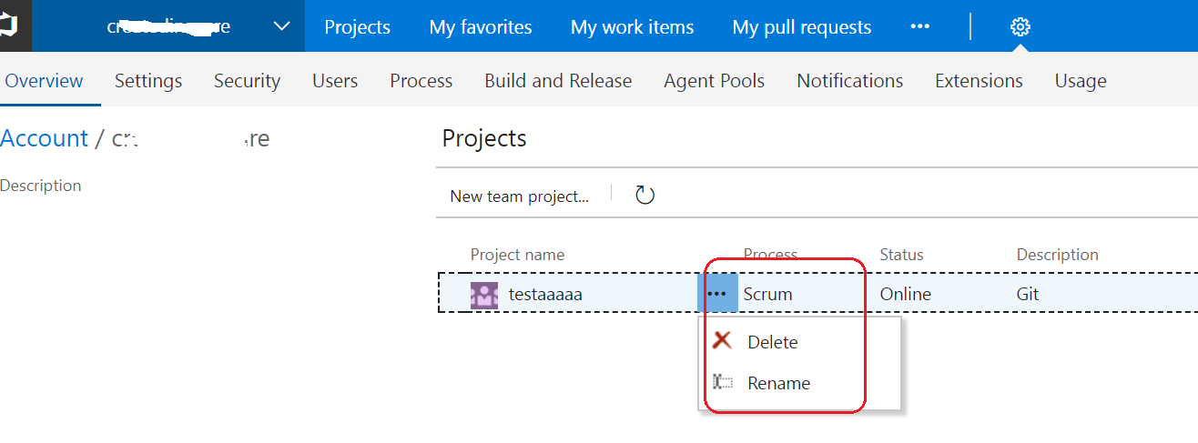 然后在创建的VSTS帐户中签名,单击“设置”按钮,然后导航到“概述”面板,以删除VSTS中的项目: