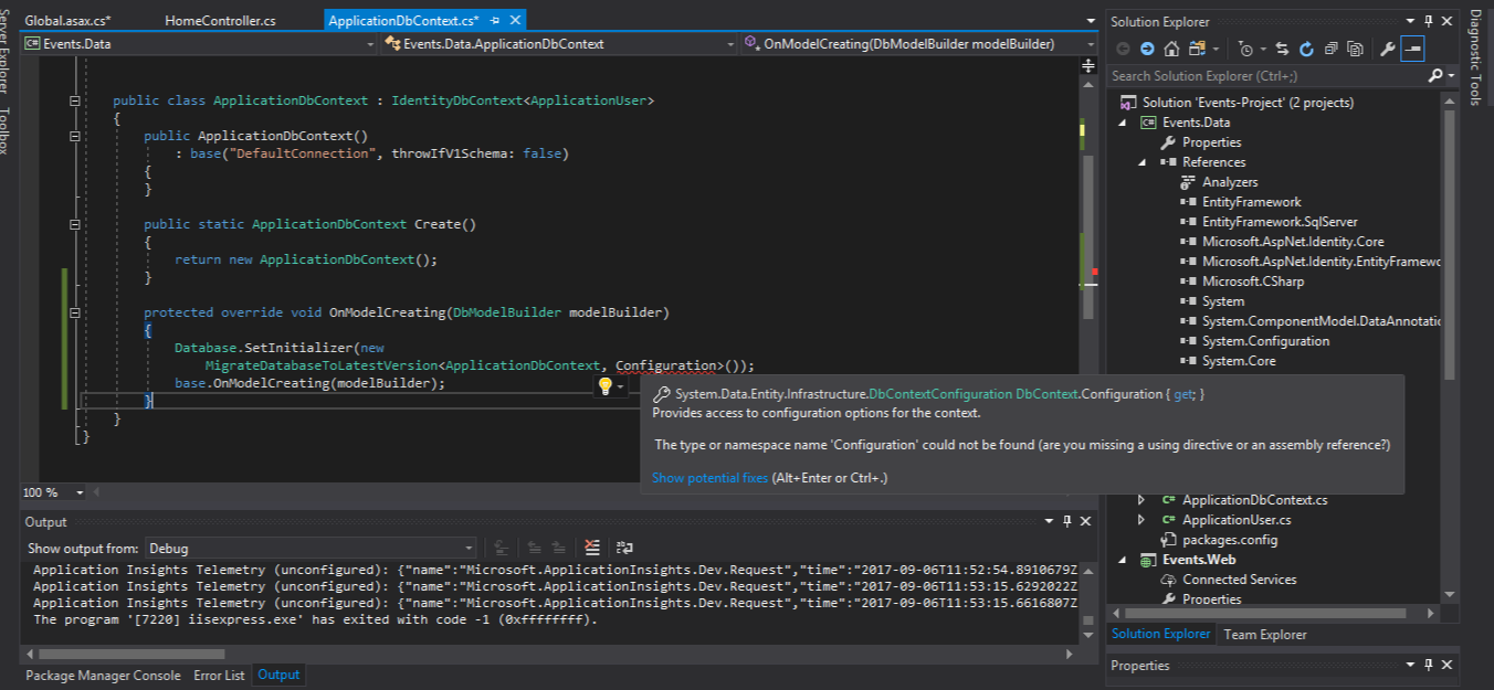 我已经在OnModelCreating类中创建了ApplicationDbContext方法,但是无法设置MigrateDatabaseToLatestVersion类,因为找不到配置类型。这是什么原因?