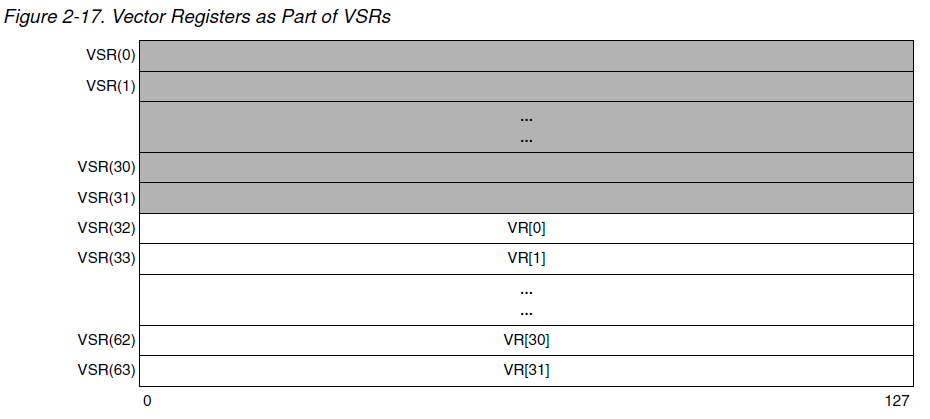 VSX增加了更多的矢量寄存器(32多个,但每个寄存器仍然有128位)和特定于VSX的指令.正如您所发现的,较高编号的VSX寄存器与用于VMX操作的寄存器共享。因此,将VMX和VSX指令混合在一个进程中是不可取的,除非您对寄存器分配非常小心。