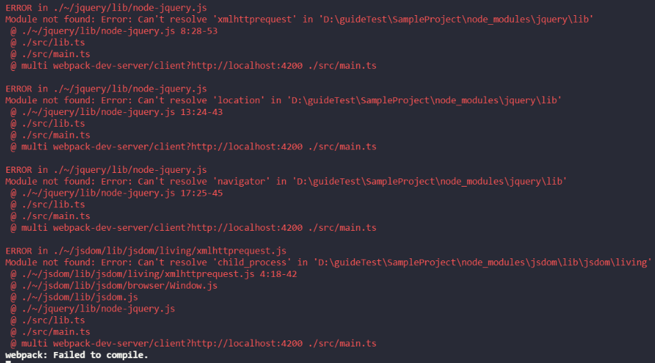 您可以尝试将packages.json中定义的包更新为更最新的版本。运行npm过时,看看哪些是过时的。但是,我不明白你想要使用jQuery的角度。通过使用jQuery来修改DOM和它非常适得其反。