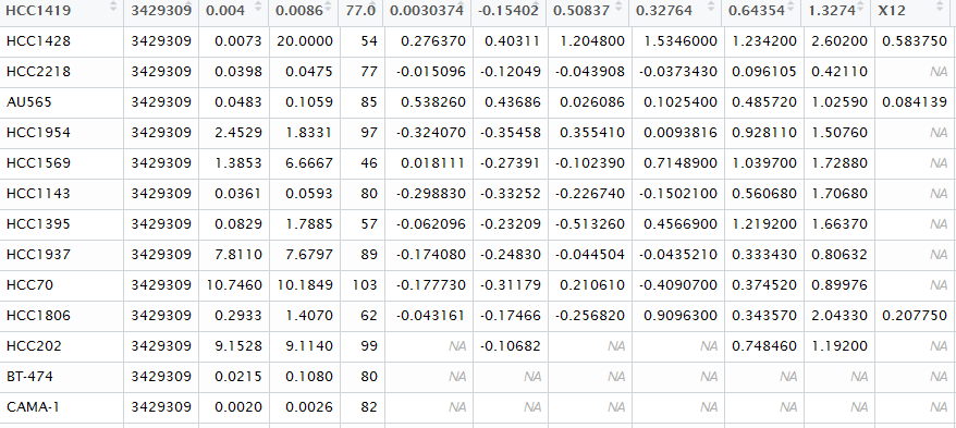 我正在分析一个数据框架与大量数据有关的蛋白质存在的一组细胞株从AMD安德森数据库。因此,我在datatable中作为行将细胞株和蛋白质作为数据("AMDDatabase")放在cols上。我需要使用相关来交叉这些数据,但是当我使用它时,它会给我一个错误“评估错误:不够有限的观察”。