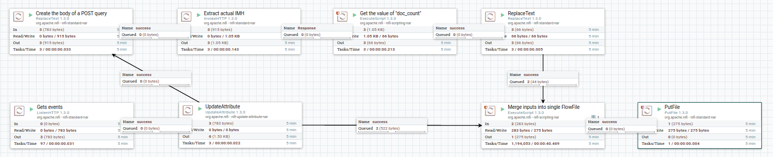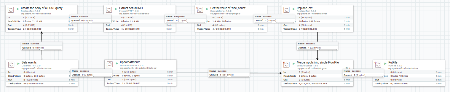 在UpdateAttribute中,我将属性filename设置为${UUID()}。然后,在命名为ExecuteScript的Merge inputs into single FlowFile中,我使用了下面所示的代码。这些文件没有合并,而是排队。