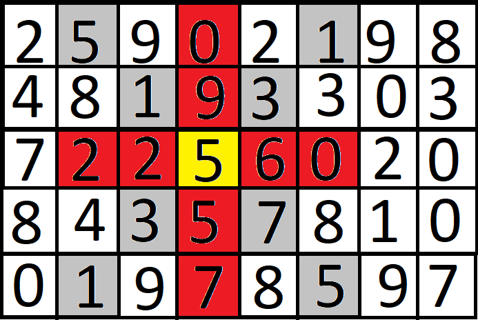 我正在做一个二维数组,从数组的一个点开始,我应该打印两个水平的,垂直的和斜的附近的单元格。