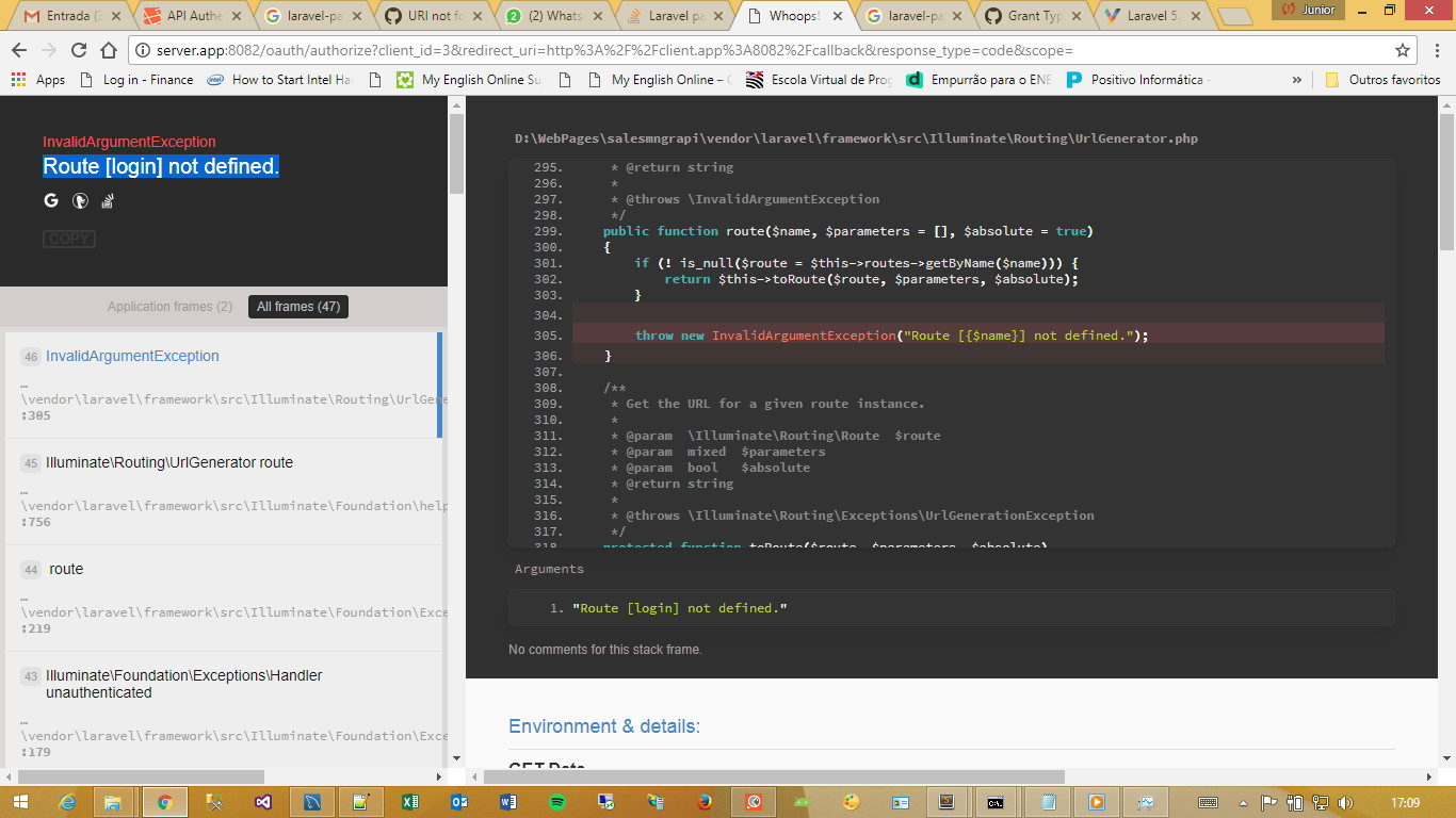 也许你有不止一个错误。看来你忘了定义普通的奥斯丁路线了。从php artisan make:auth或Auth::routes()开始。OAuth路由没有login路由,您得到的错误表明您没有定义login路由。它实际上是在Auth::routes()中定义的。