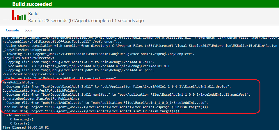 由于您的项目类型是“Excel2013和2016VSTO外接程序”,而不是"Excel外接程序“,因此我们应该使用ClickOnce发布方法来部署项目。我用VS 2017创建了一个示例演示,并使用TFS 2017构建了它。您可以检查它是否有帮助: