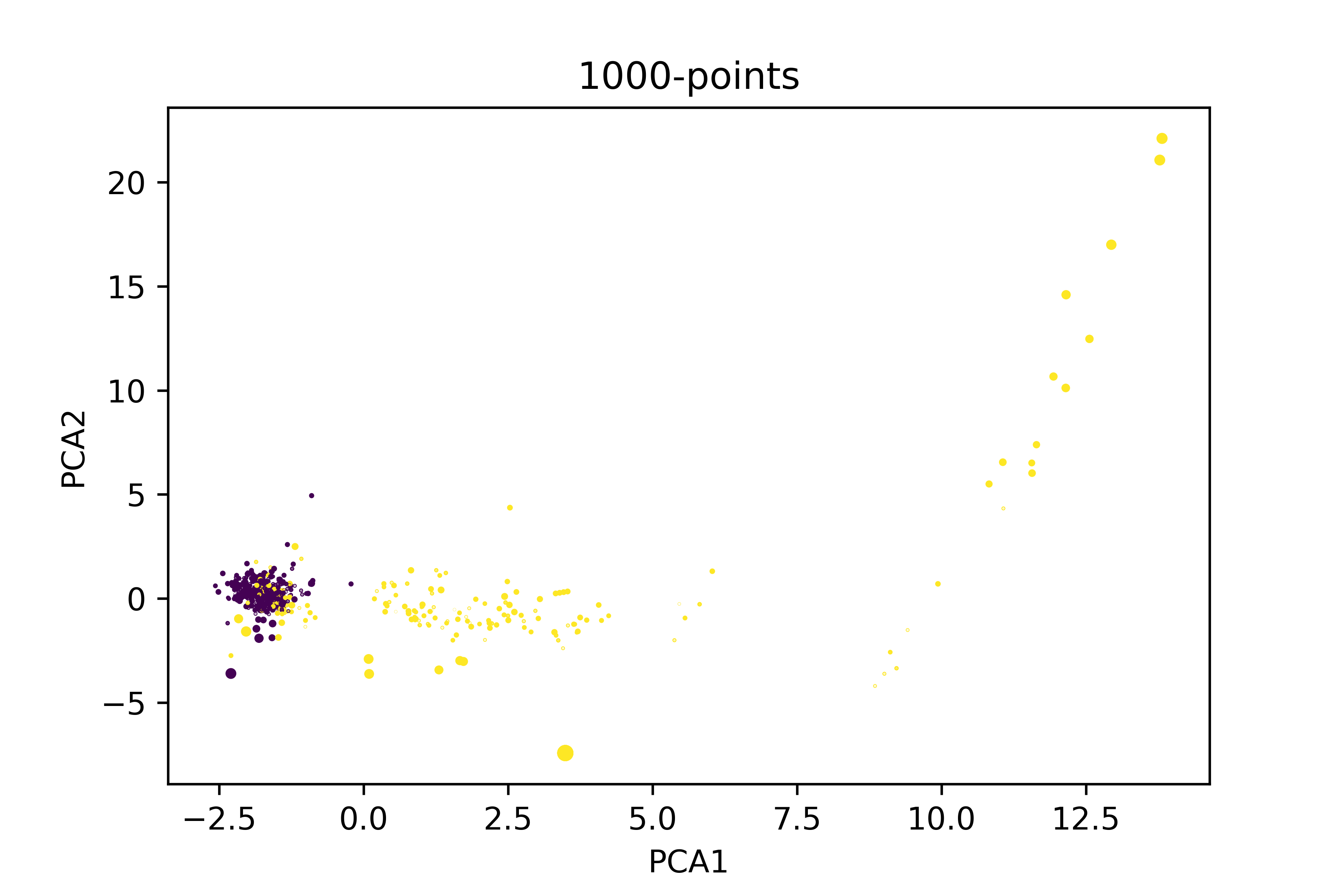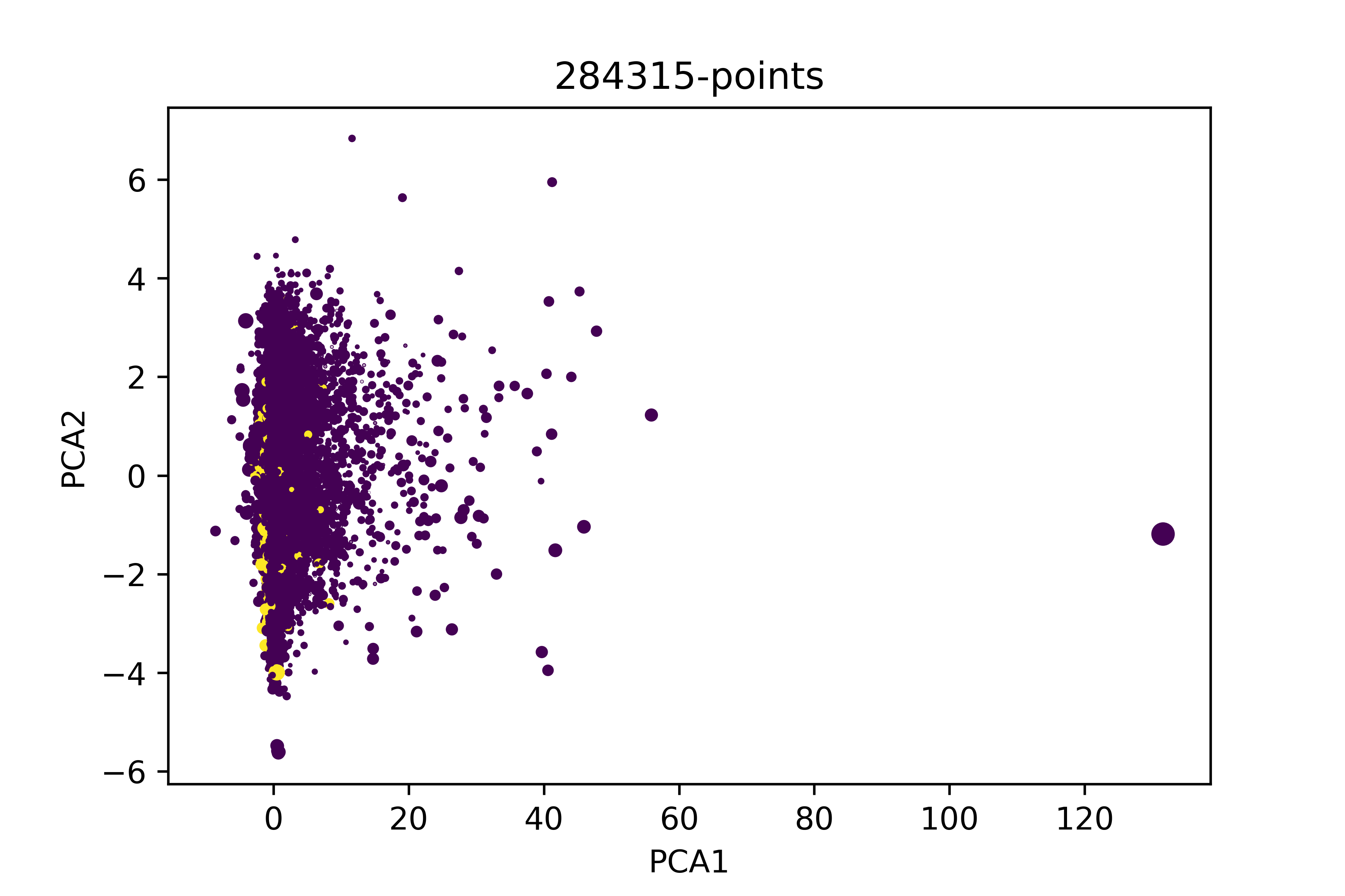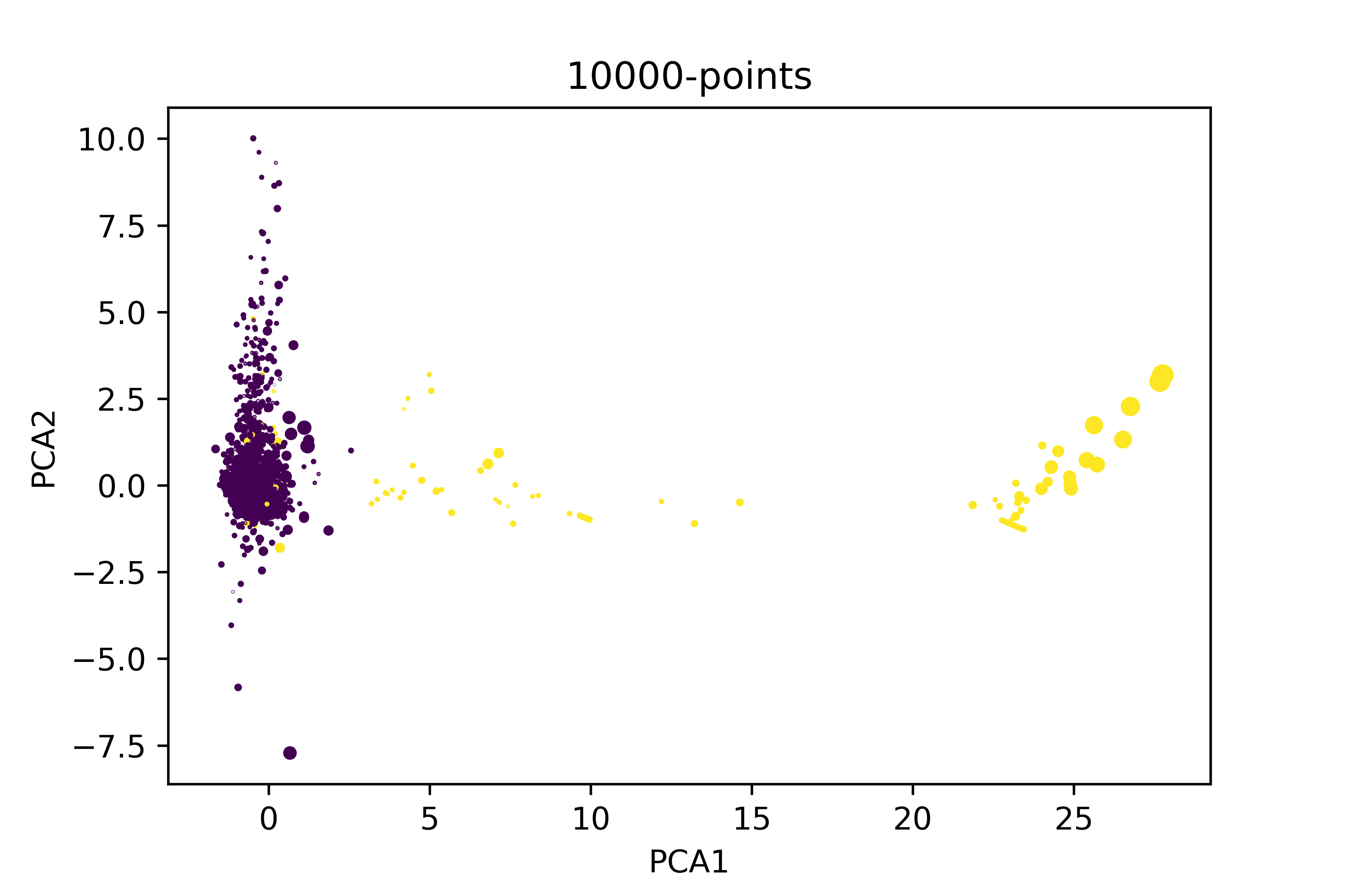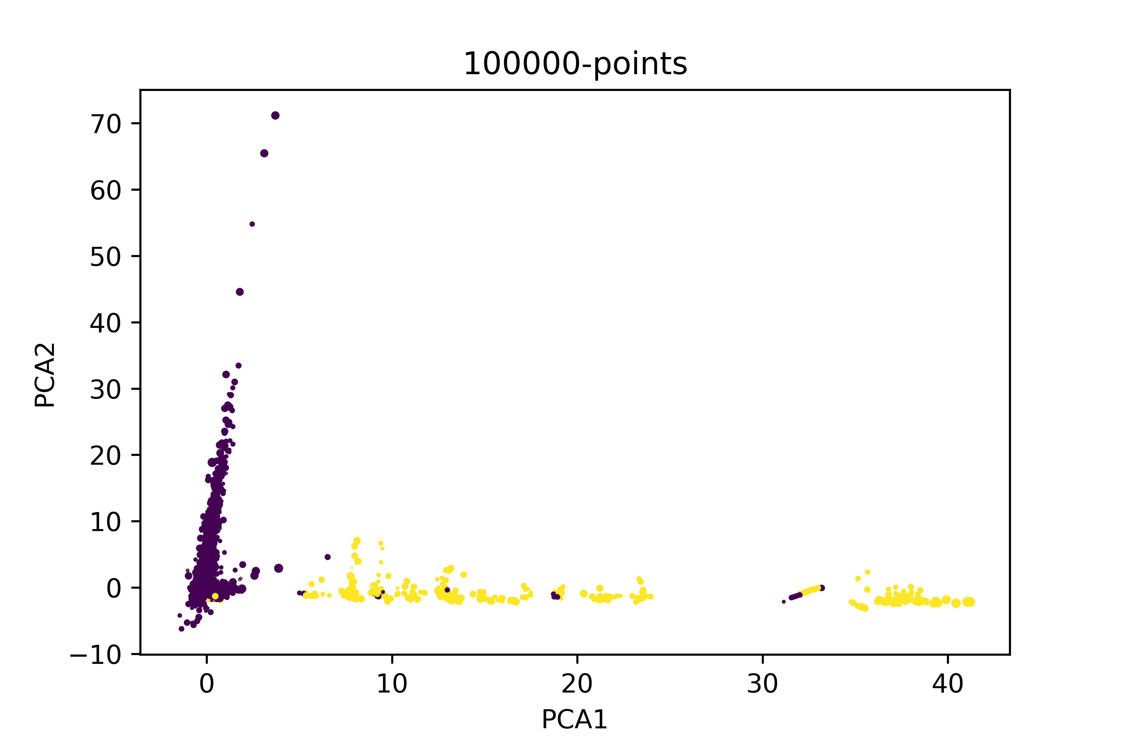现在,我不知道在简化的数据集上安装PCA以进行更好的分解是否有意义。例如,如果我使用100000分的主成分分析,我们可以说所有PCA1 >5的条目都是欺诈行为。