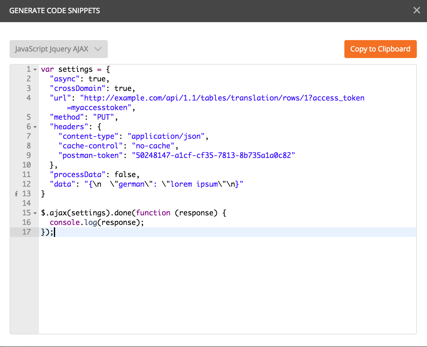 您还可以在Postman中为该请求生成相应的代码片段。在这种情况下是: