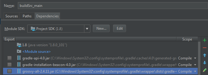... 15 more因此,当我查看项目结构时,我看到groovy-all-2.4.11.jar被自动加载到buildSrc模块中。