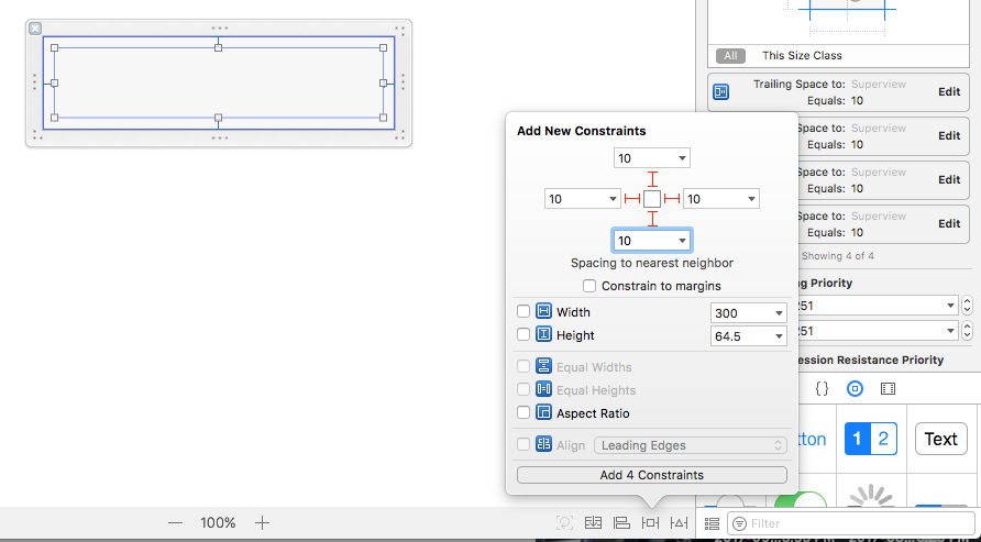 将标签拖到单元格中。假设您希望从标签的两边有10个像素的边距。为所有(顶部、底部、前导、尾随)设置10的常量,然后单击Add 4约束。如下图所示