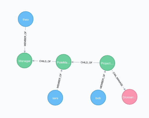 例如,对于"theo",我们应该返回sara和bob,因为sara是PoleManager的成员,而后者是ProjectManager组的父级。Bob是拥有管理术语表的权限的ProjectManager组的成员。