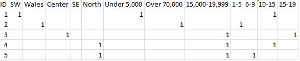 , dcast(.SD, ID ~ value, length)]ID SW Wales Center SE North Under ?5,000 Over ?70,000 ?15,000-?19,999 10-15 1-5 6-9 15-19 1: 1 1 0 0 0 0 1 0 0 1 0 0 0 2: 2 0 1 0 0 0 0 1 0 0 1 0 0 3: 3 0 0 1 0 0 0 0 1 0 0 1 0 4: 4 0 0 0 1 0 0 0 1 0 0 0 1 5: 5 0 0 0 0 1 0 0 1 1 0 0 0 6: 6 0 0 0 0 1 0 0 1 0 0 1 0