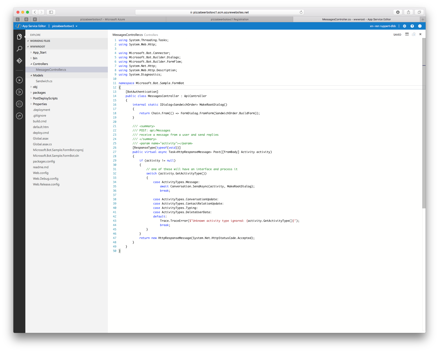 我刚刚在Azure上创建了一个机器人服务,它看起来与上次完全不同。那时我得到了一堆CSX文件。现在,它已经创建了一个看起来像一个成熟的ASP.NET应用程序(见截图)。