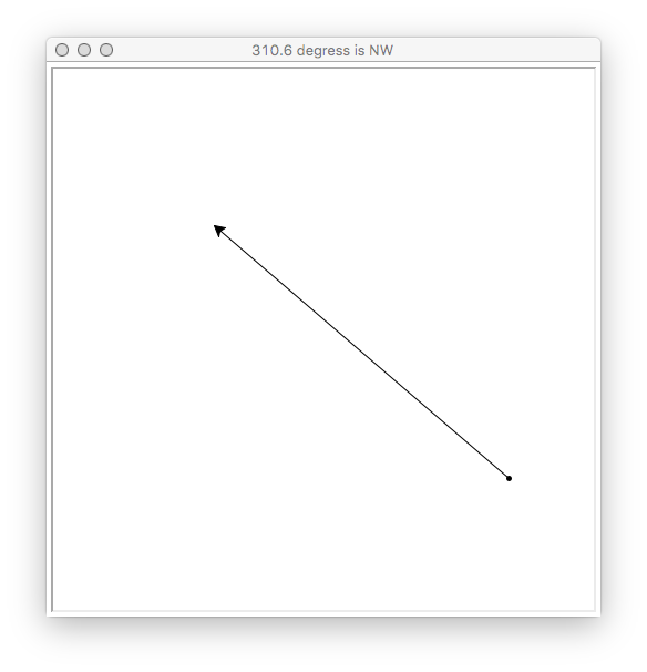 我希望这是有帮助的--为了方便,我使用了建立在tkinter上的Python海龟来实现它。我切换到标志模式,使北0度和正角顺时针方向(即东方是90度)像一个指南针。海龟方法towards()所做的大部分事情都是你想做的,所以在计算基本方向时,我试图模仿它: