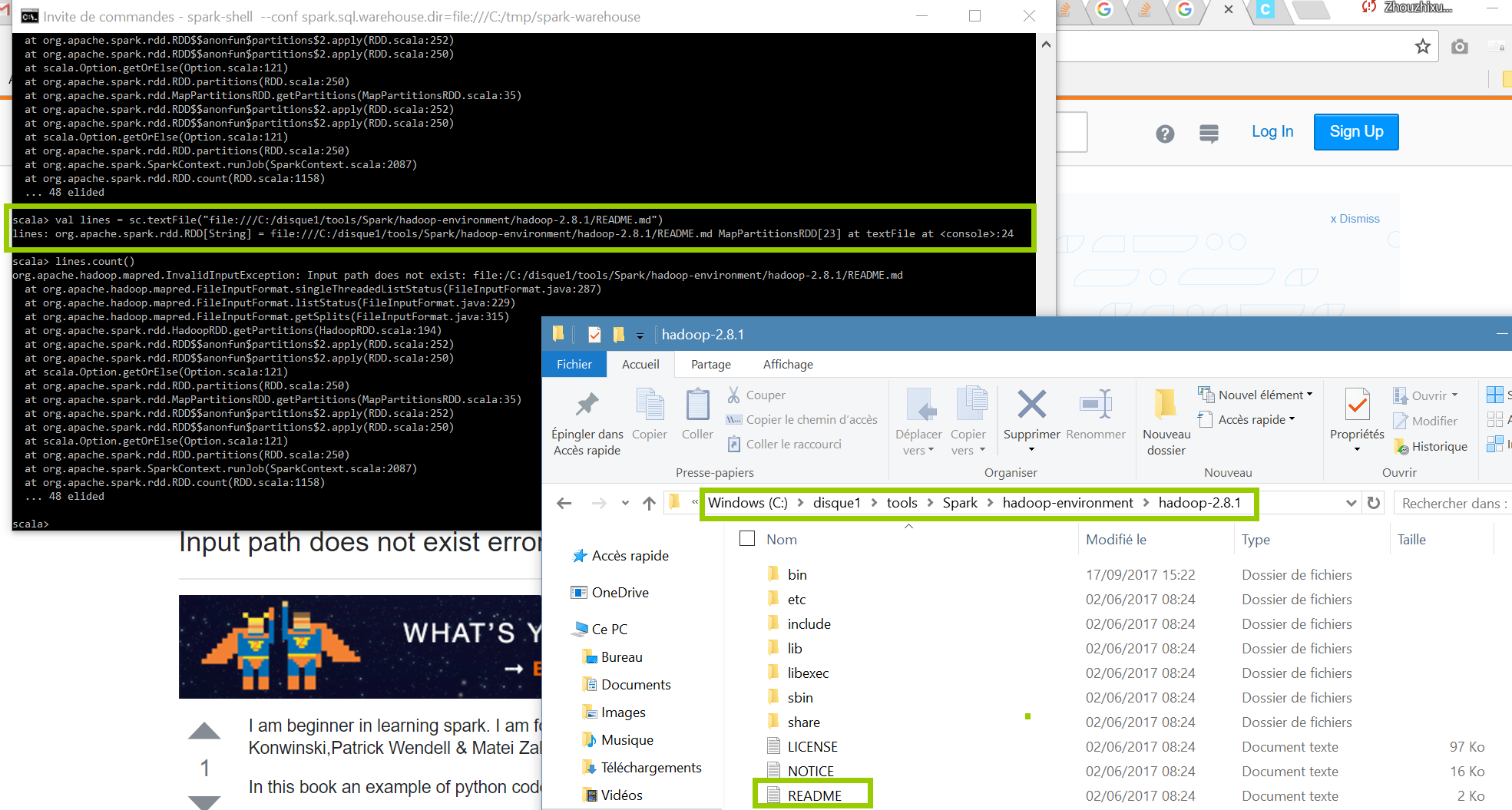 scala> val lines = sc.textFile("file:///C:/disque1/tools/Spark/hadoop-environment/hadoop-2.8.1/README.md")