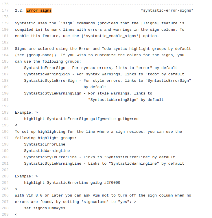 我试着做:help syntastic,但这并没有显示出任何东西。我有个提示,E149: no help for syntastic。我还在谷歌上搜索了一下,但在用于语法的github或spacevim文档中找不到对这些符号的描述。我还在github上找到了语法帮助文档,但是错误标志部分没有解释任何默认设置等等。https://github.com/vim-syntastic/syntastic/blob/master/doc/syntastic.txt
