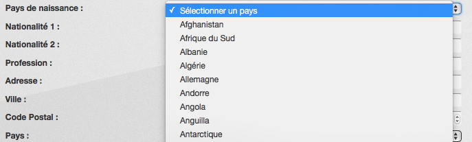 PaysNaissance = CountryField(blank_label='Sélectionner un pays', verbose_name='Pays de naissance')然后,我的表单显示这样的国家: