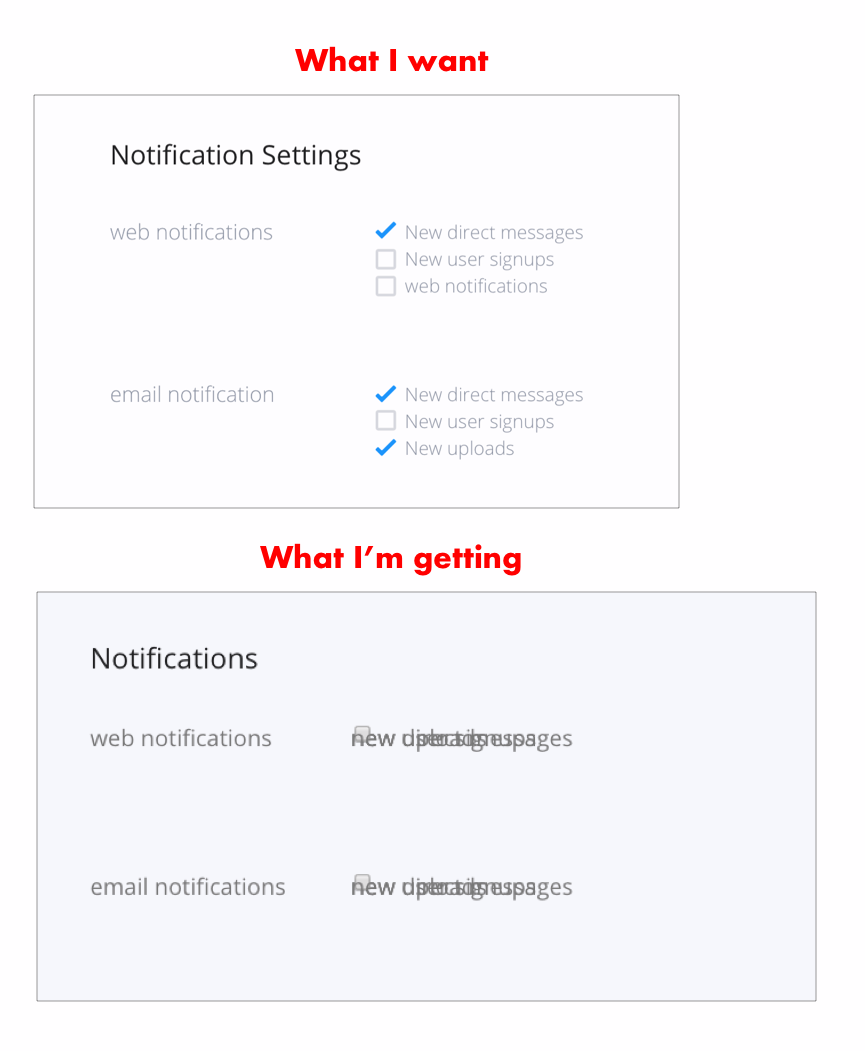 我很难让复选框正确地堆叠在他们自己的网格列中。我使用的是ReactQL (jsx),所以我不认为它会在代码片段编辑器中正确显示。浮标在这里没用。