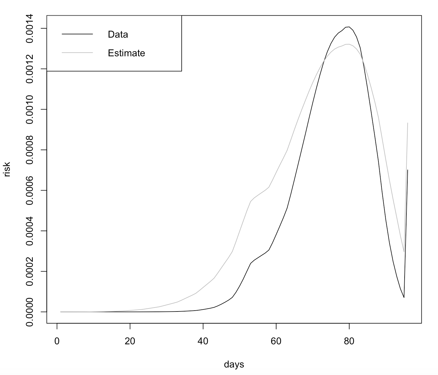 legend("topleft", c("Data", "Estimate"), col = c("black", "grey"), lty = c(1, 1))