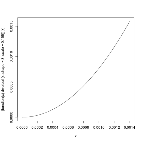 而参数在相关范围内的威布尔密度如下所示:curve((function(x) dweibull(x, shape=3, scale=0.155))(x), 0, 0.0014)