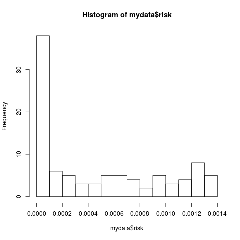 例如,下面是数据的分布:hist(mydata$risk, breaks=15)