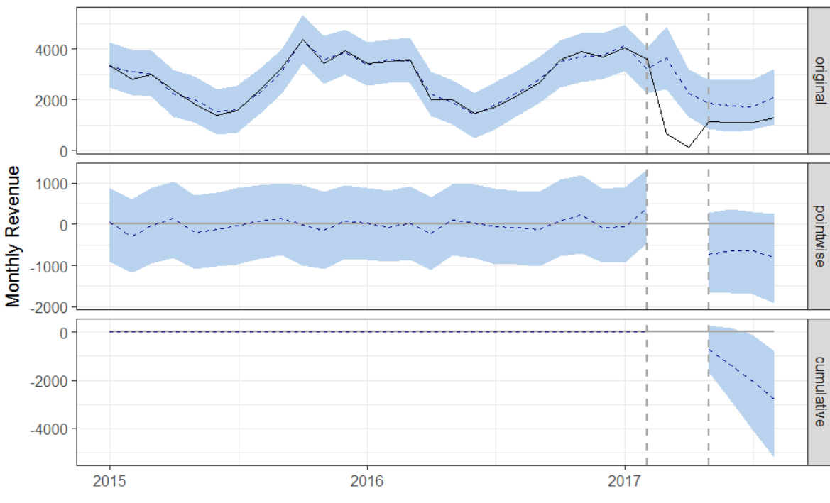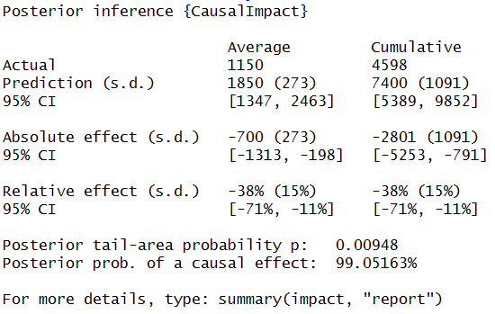 我感到困惑,因为我认为有一个矛盾-模型返回一个非常低的p-值(0.009),这表明有一个偶然的效果,但“实际”线(实线)似乎很好地在95%的置信范围内的反事实。如果有因果影响,你不认为这条线会超出蓝带吗?