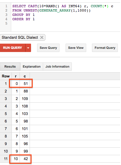 SELECT fhoffa.x.random_int(0,10)要获得0到n之间的随机整数(在本例中为9),需要在FLOOR之前使用CAST