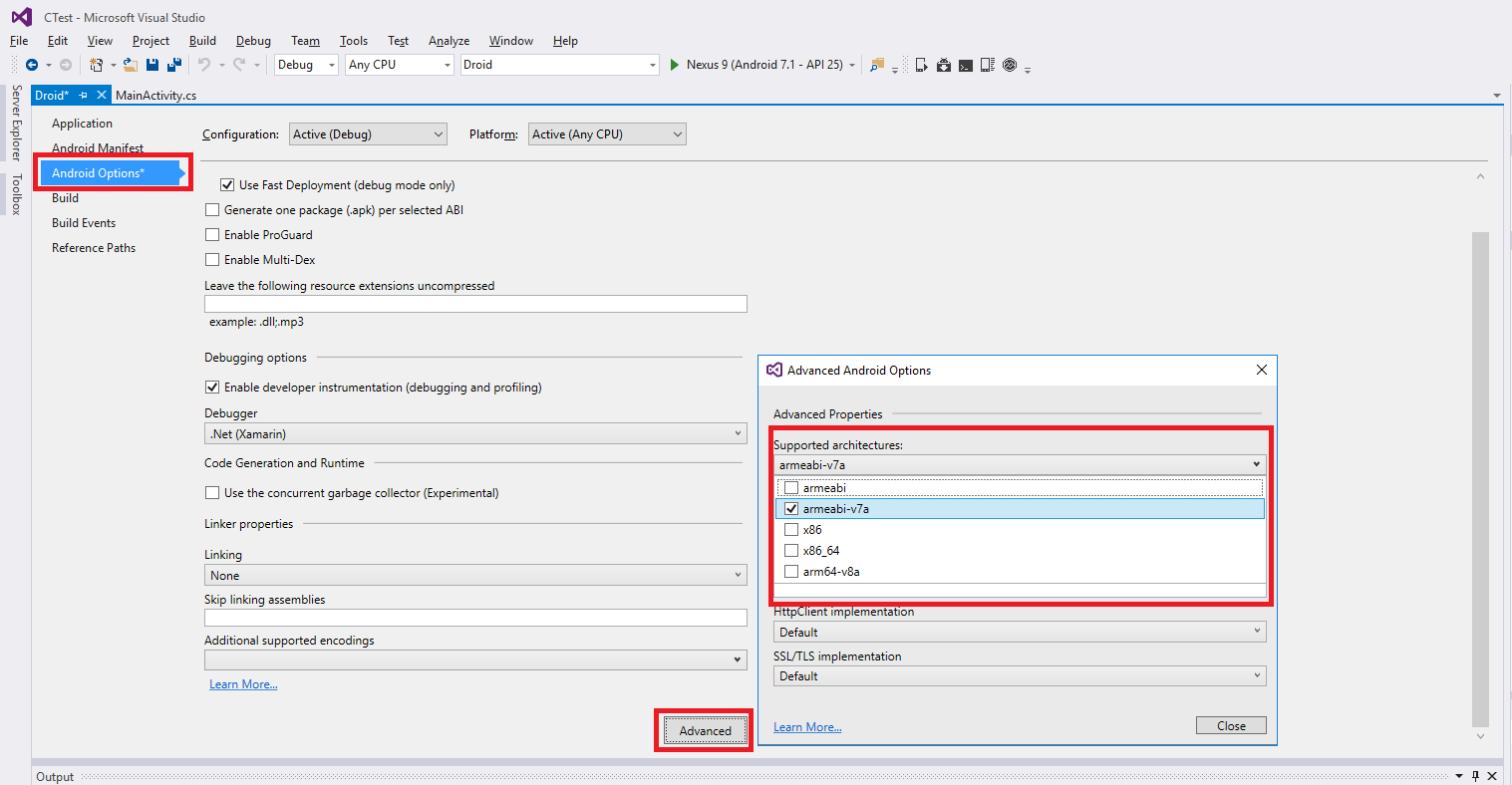 [Xamarin.Droid.project]->[Properties]->[Android Options]->[Advanced]->[Supported architectures]