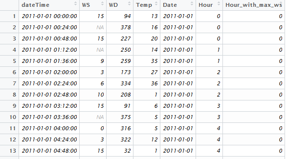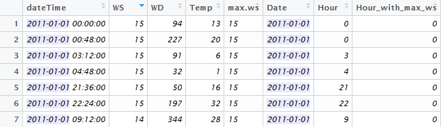 我想强调的是,如果有几个小时有相同的最大风速(在下面的例子: 15),只有第一个小时的最大值(WS)将显示出来,虽然风速15是在那一天在0,3,4,21和22小时!所以你可能需要一个更具体的逻辑。