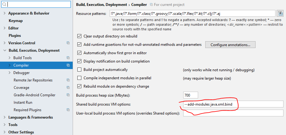 打开File -> Settings -> Build, Execution, Deployment -> Compiler,并将--add-modules java.xml.bind添加到Shared build process VM options