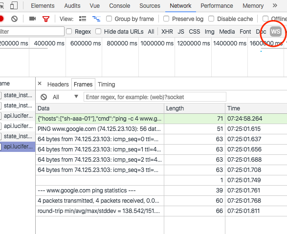 2017-09-24 07:25:01.562586 b'round-trip min/avg/max/stddev = 138.542/151.557/180.163/16.662 ms\n'但是,浏览器的websocket调试信息是: