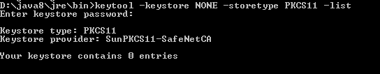 security.provider.11=sun.security.pkcs11.SunPKCS11 C:/ocsp/safenet-provider.cfg下面是我在java keytool上执行的命令