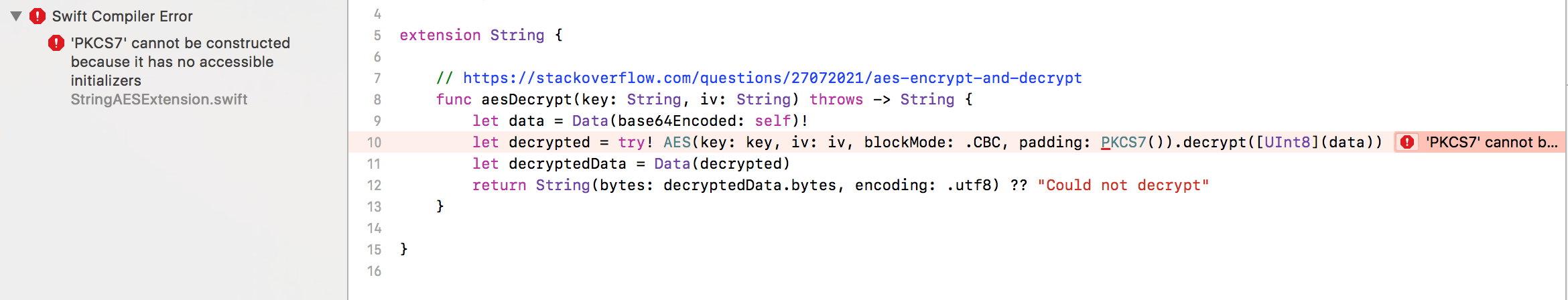 我使用的是Xcode 9.0和CryptoSwift (0.7.2)。我试图扩展字符串来解密AES128加密的字符串。我已经成功地在Pods中添加了CryptoSwift,但是我得到了下面的编译错误--我做错了什么?