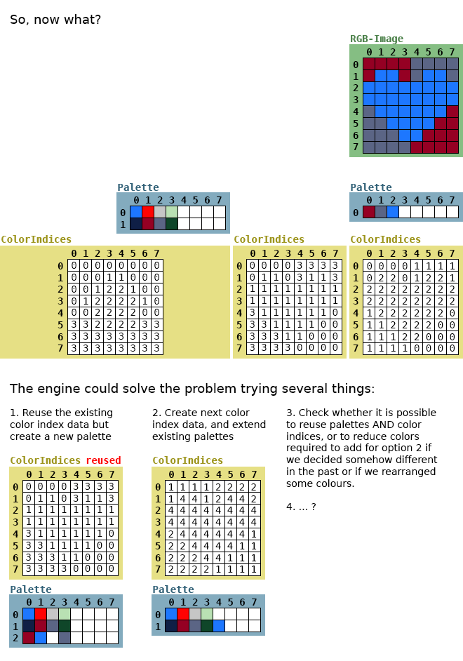 下面的图片描述了--的实际问题:如何决定什么是最适合图像的?创建一个新的调色板,创建一个新的颜色索引,如果我们过去的决定不是这样,那么一切都会好呢?我们怎么知道呢?
