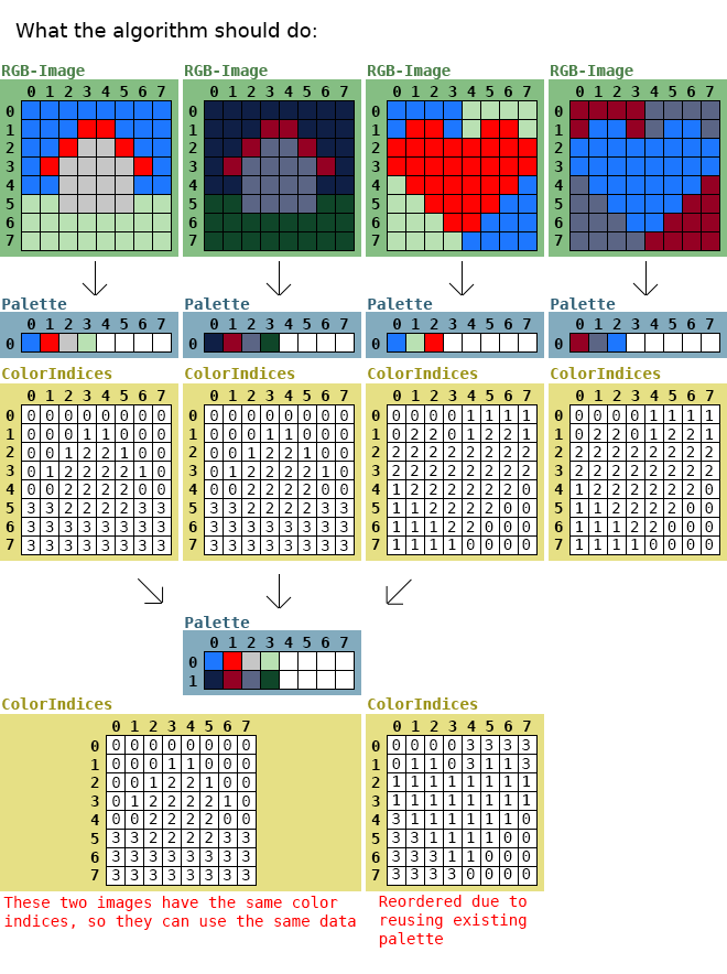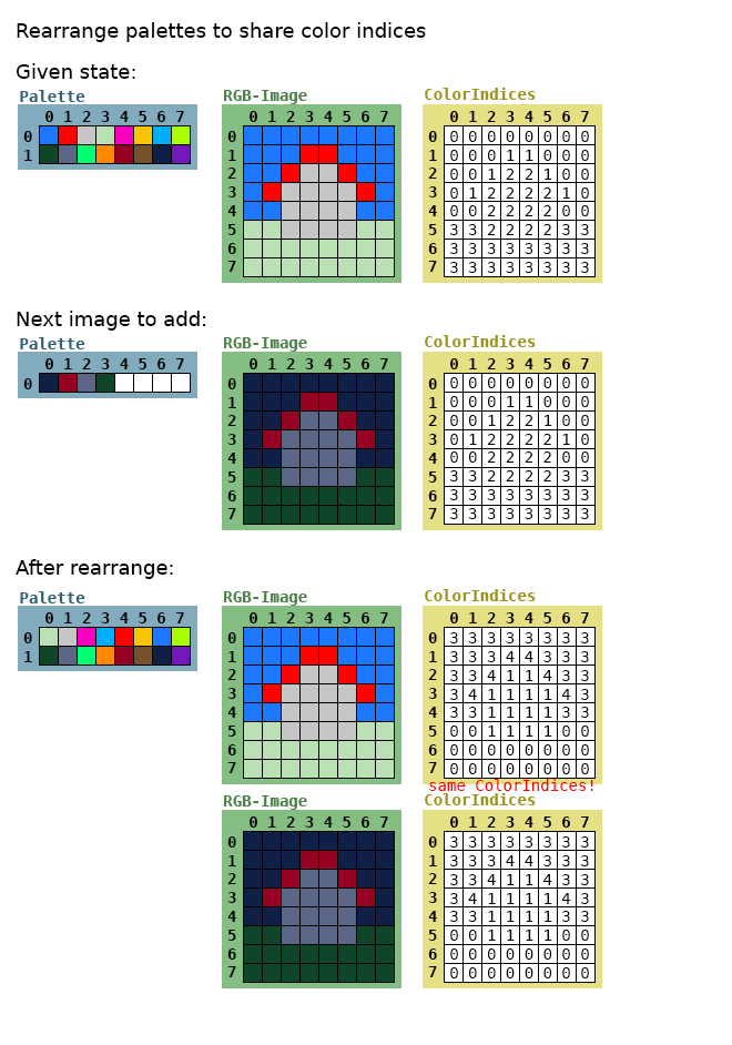 如您所见:最后一步中的调色板已被重新排列,以与下面相同的颜色相匹配。但这可能是一个复杂的过程,重新安排了许多其他图像,以及。