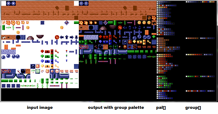 左边是您的输入图像,中间是使用全局group[]调色板的雪碧输出,而不是空的精灵。右边是按组排序的唯一调色板,右边的大多数列是代表该组的组调色板。