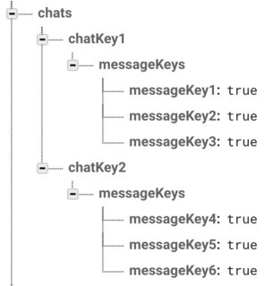 我认为你应该平平你的数据,以获得消息键和聊天键,只使用消息文本。您可以将实际消息保存在单独的路径中(如" messages "),并且只在相关聊天的路径中保留消息键,如下所示: