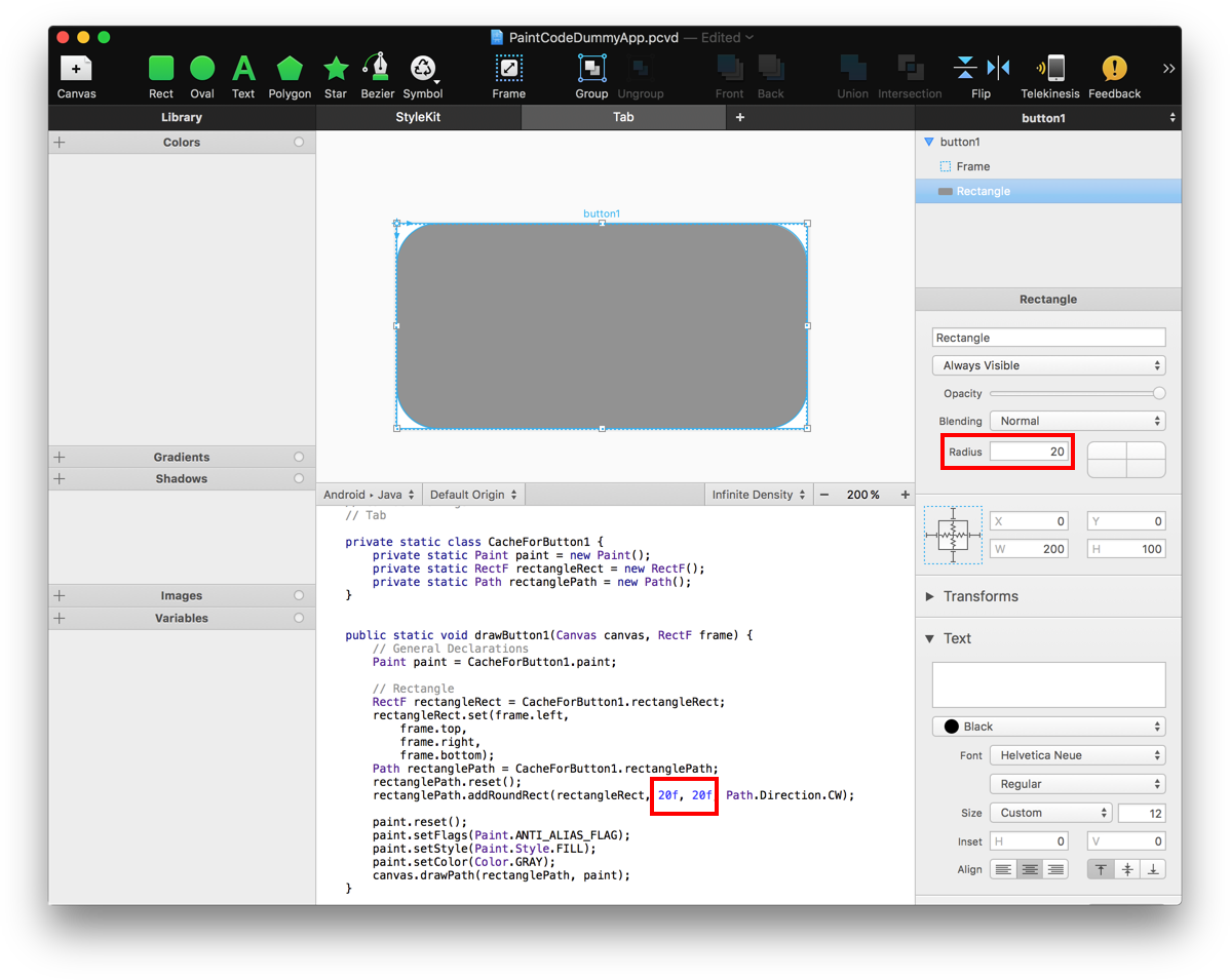 我记得有一个类似的问题,在与PaintCode支持人员交谈之后,我们想出了一个将DP转换为PX的函数。因此,比如说,在Android系统中,考虑到不同的显示密度,这20个点将被转换成“任何”像素。