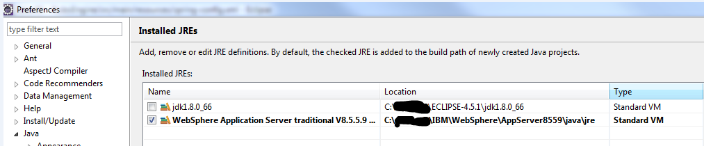 1.在Files\IBM\WebSphere\AppServer\java\jre\bin\javaw.exe",文件"-vm C:\-vm重新启动eclipse和服务器“中添加此条目;2.Windows->Preferences->-vm->已安装的JRE