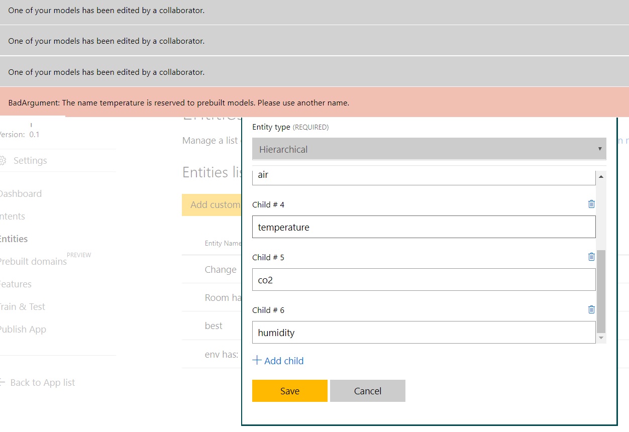 我正在创造一个机器人,我可以问一个房间的特定温度。我已经做了一些定制的东西,在那里我可以读出房间的温度。但是当我构建一个分层实体时,它拒绝使用这个词,因为LUIS在预先构建的模型中使用了这个词。