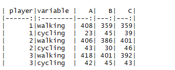 | player|variable | A| B| C|