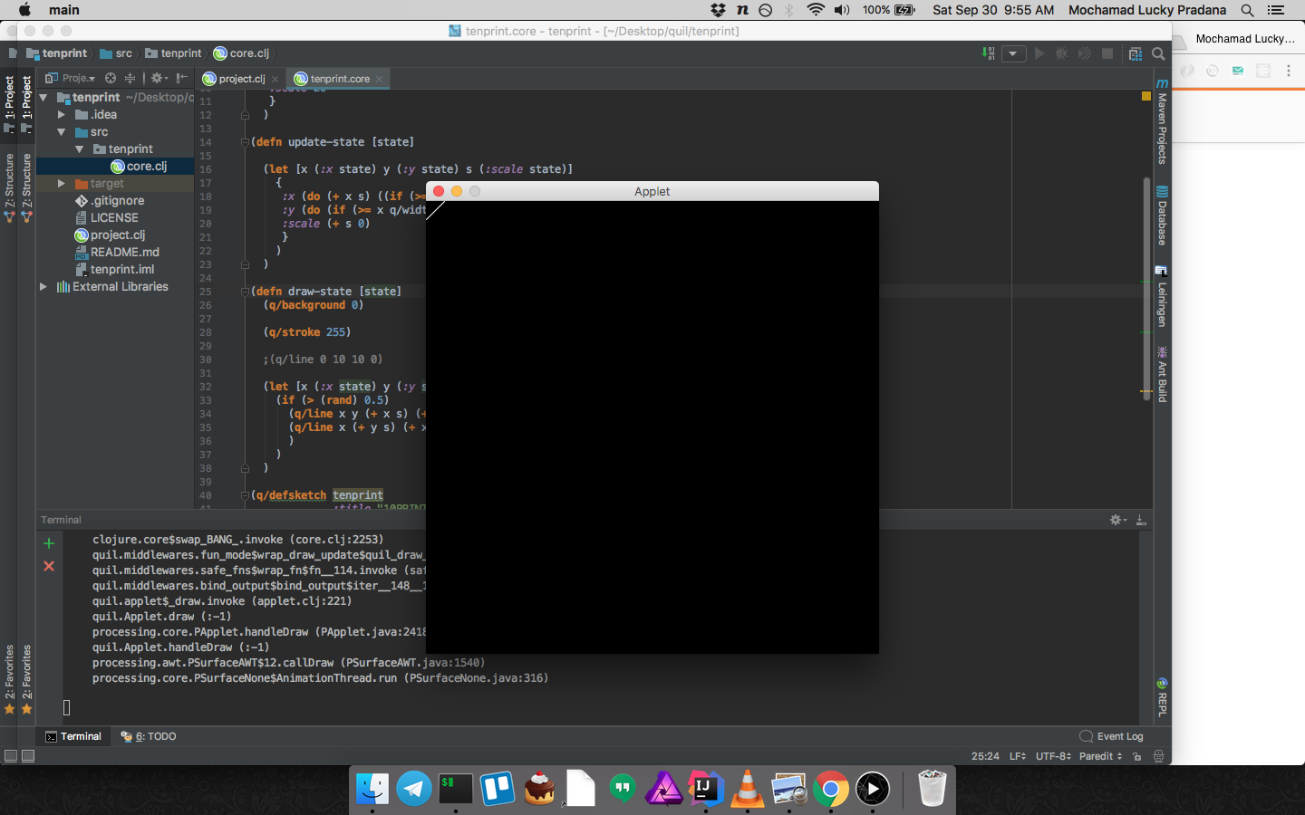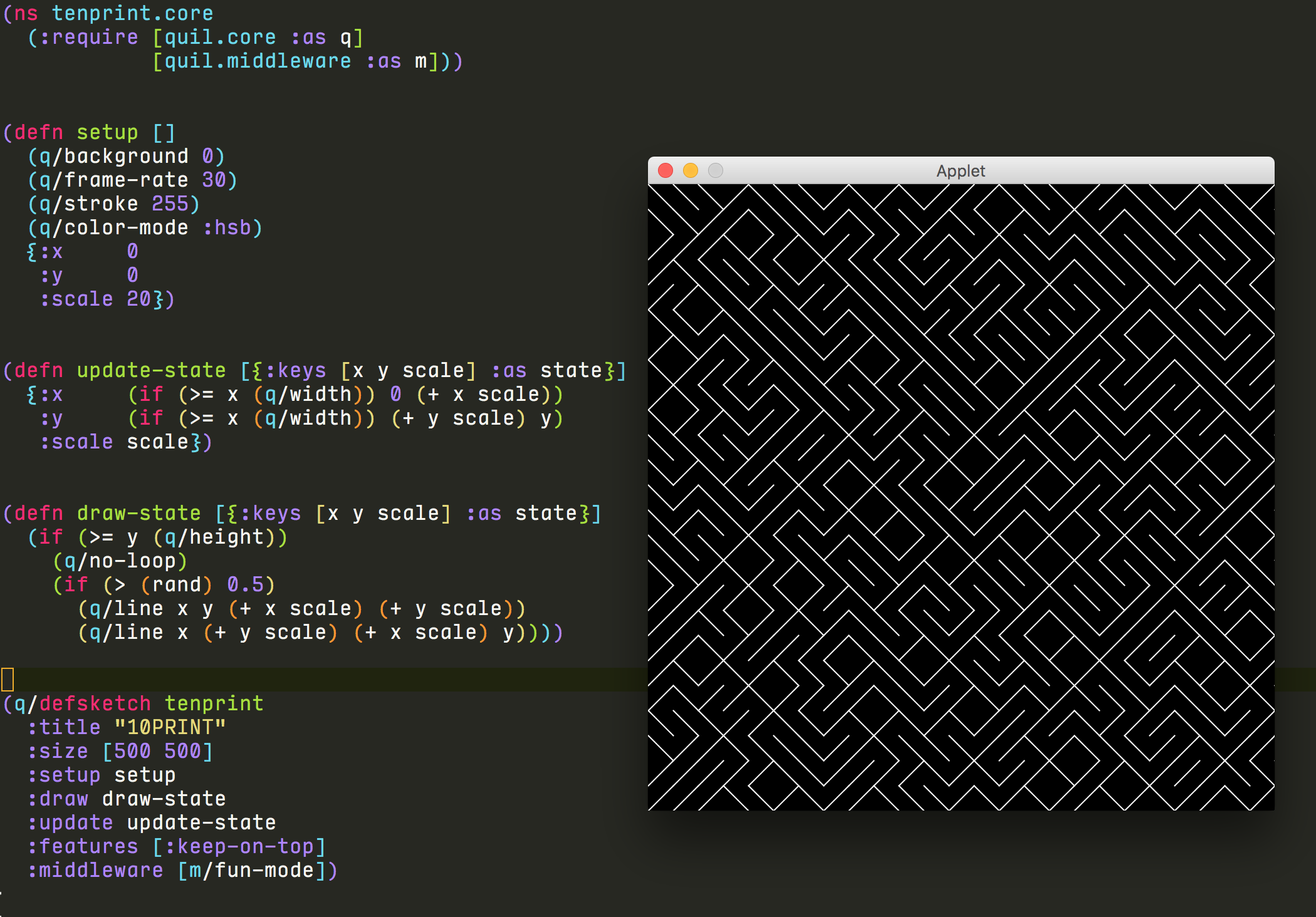 我正试图用Quil编写10 PRINT代码。我试图将这个代码从使用露娜的twitter帖子https://twitter.com/ACharLuk/status/913094845505445890中转换出来。