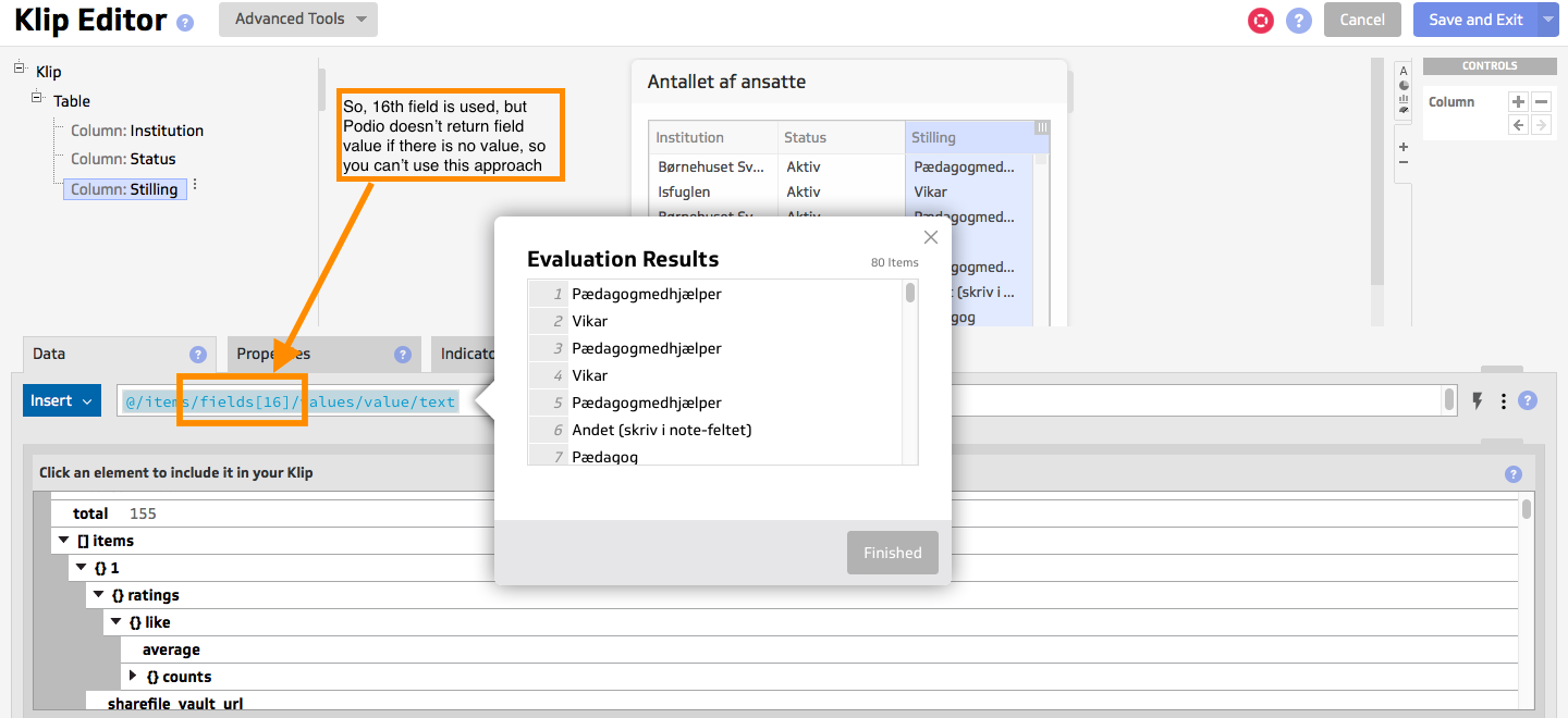 使用API,我已经将Podio应用程序中的数据导出到Klipfolio,但并不是所有的数据都被导出了。当试图显示字段中的所有值时,只显示其中的一些值。
