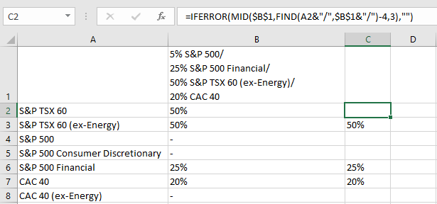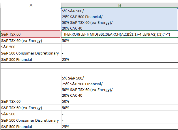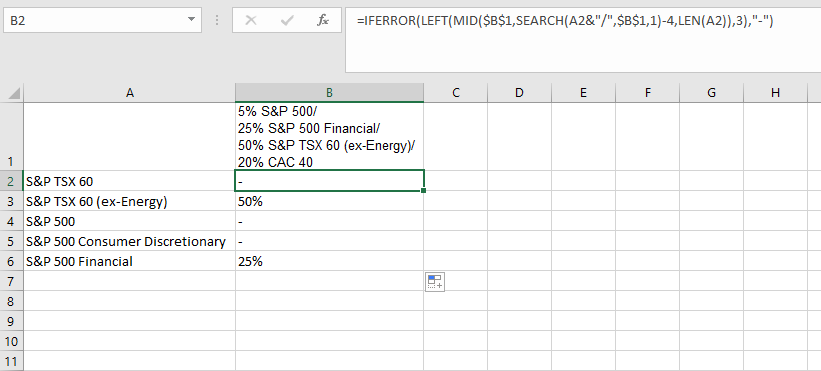 我在Excel中有以下情况。Column A包含一个基准列表(例如,标准普尔TSX 60),而B1包含一个综合基准列表,每个基准前面都有百分比: