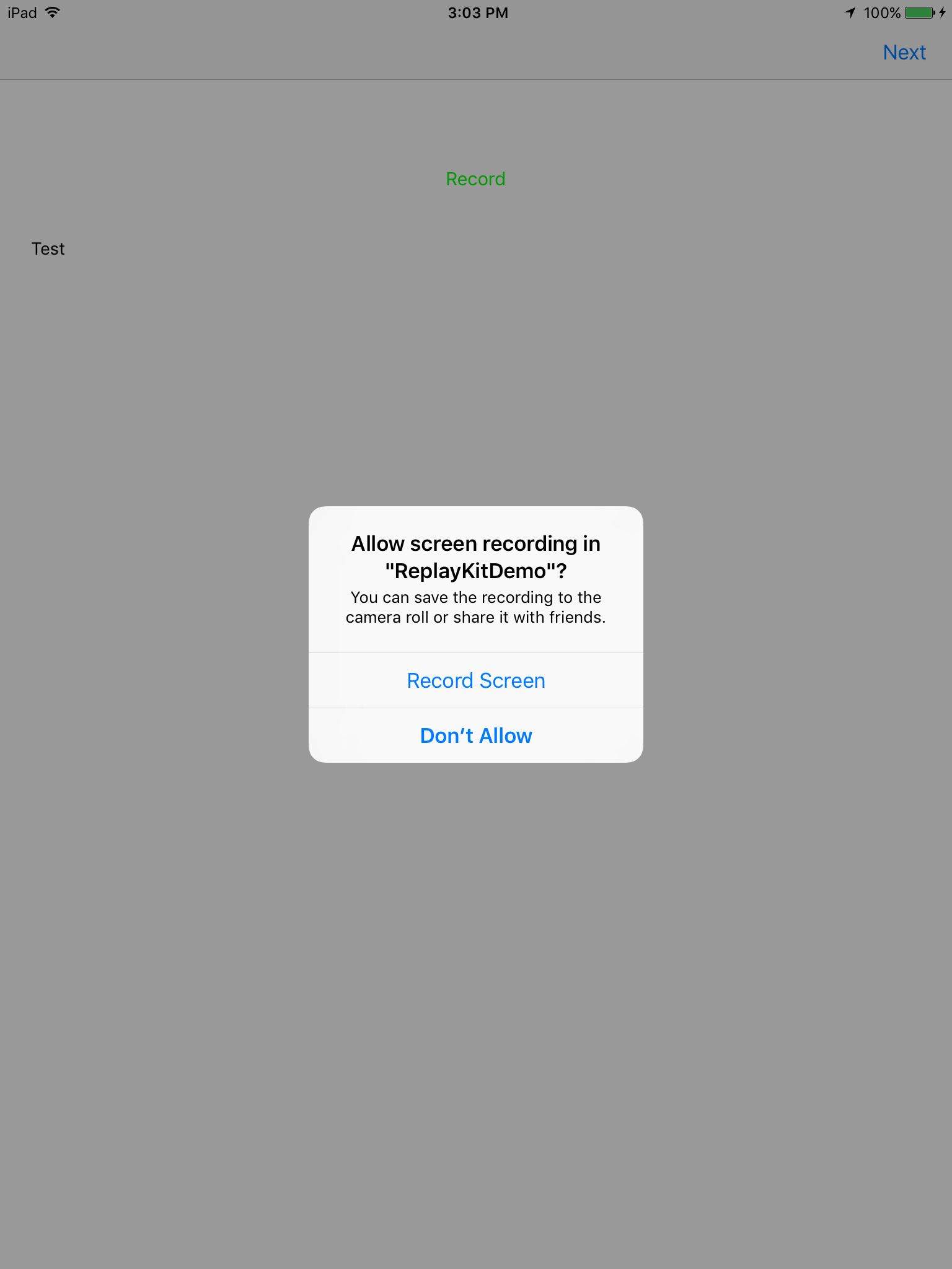 RPScreenRecorder.shared().startRecording(withMicrophoneEnabled: false, handler: { (error) in