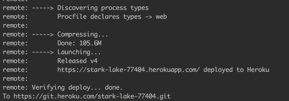 git add .git commit -m "init commit"heroku creategit push heroku master这是我的结果,但您可能会看到类似的情况: