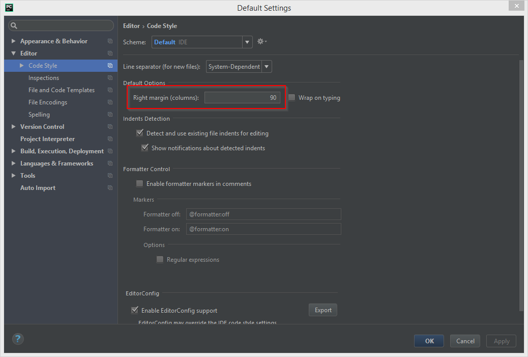注意:在较新版本的PyCharm中,设置已重命名为硬包装在,但它的行为相同,还有一个额外的选项允许更多的视觉指南。