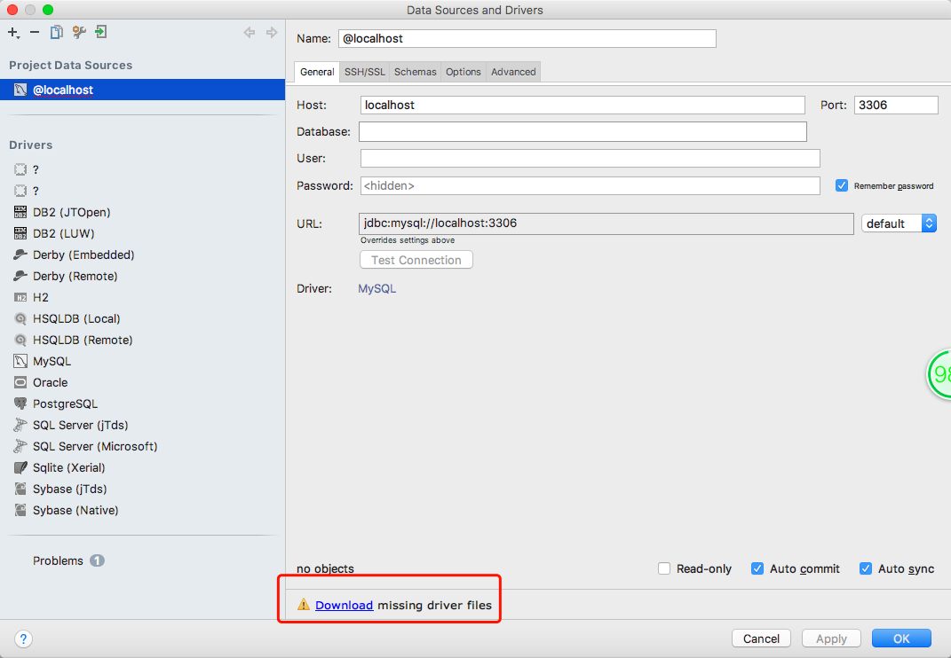 作为的解决方案,您可以手动下载驱动程序并将它们放置在必要的位置。下载bo、JAR和mysql-connector-license.txt许可文件(直接从http://download.jetbrains.com/idea/jdbc-drivers/mysql-connector-license.txt of从MySQL下载)。将两个文件放置在路径{idea-config-dir}/jdbc-drivers/MySQL Connector/J/5.1.40中(必要时修改版本号)。{idea-config-dir}的位置可以在IDE用来存储设置、缓存、插件和日志的目录帮助文档中查找。例如,c:\Users\Dilbert\.IntelliJIdea2017\config或~/Library/Preferences/IntelliJIdea2017