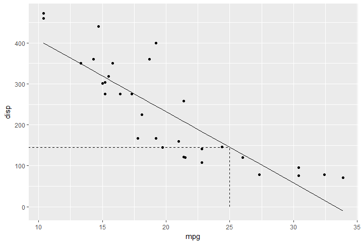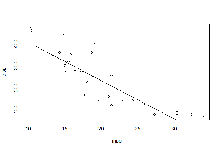 ymax <- as.numeric(predict(model, data.frame(mpg = xmax ))) # use x to get f(x)