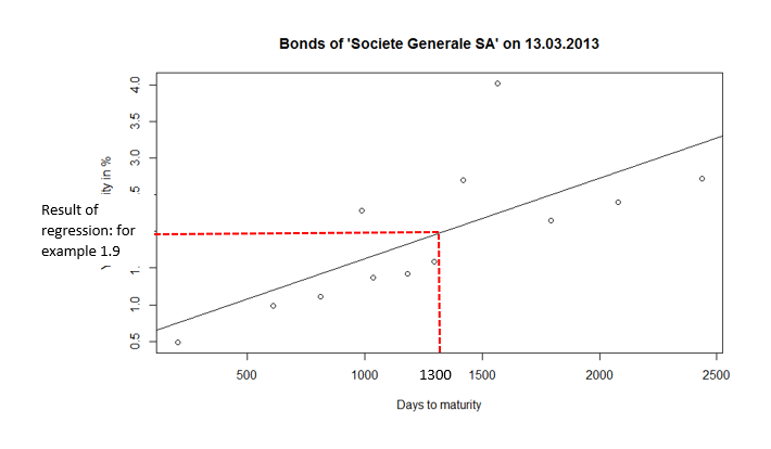 现在我想构建一个合成的5年期债券,这意味着我需要在x=1300的回归线上的价值,在到期日和相应的y值。